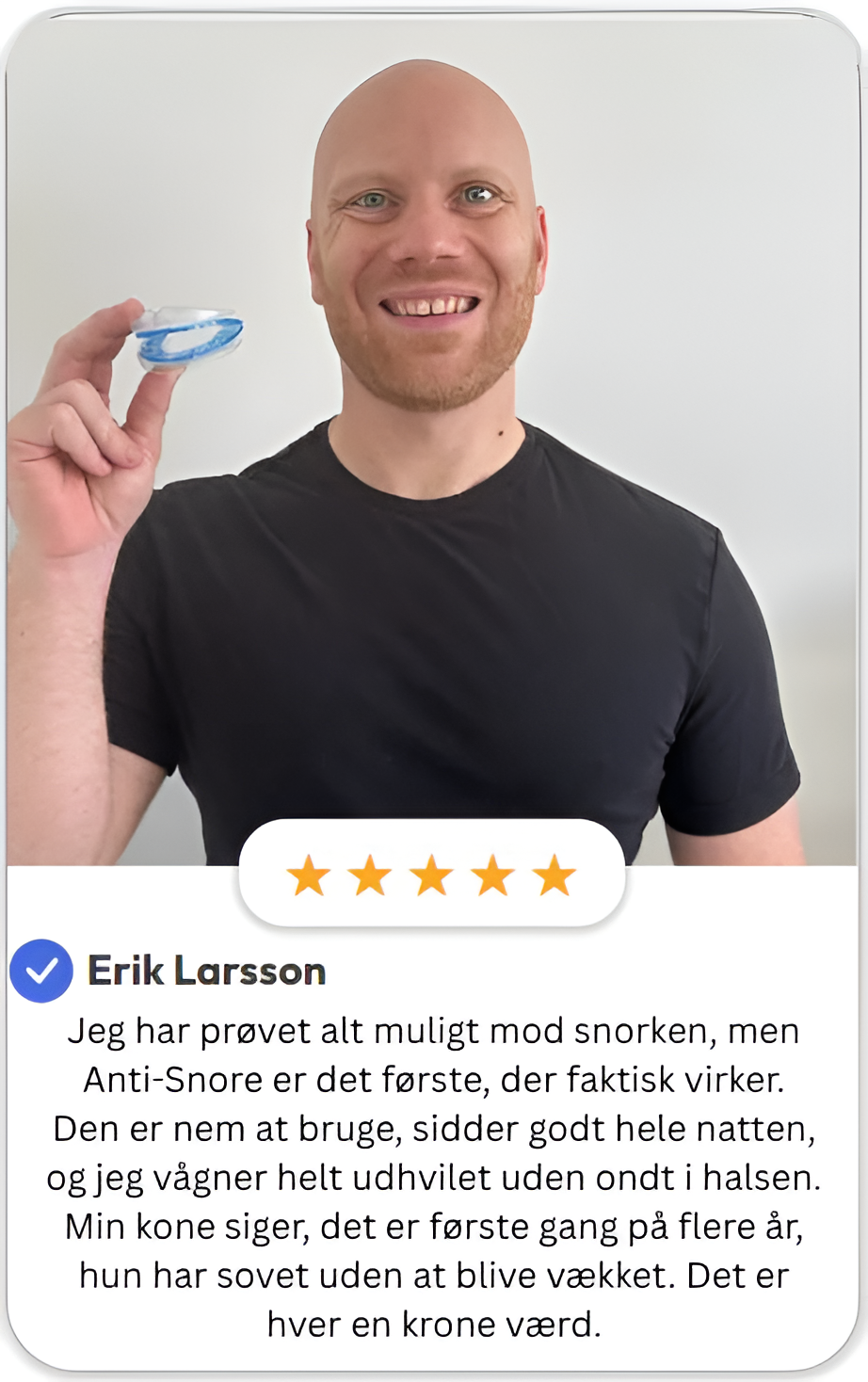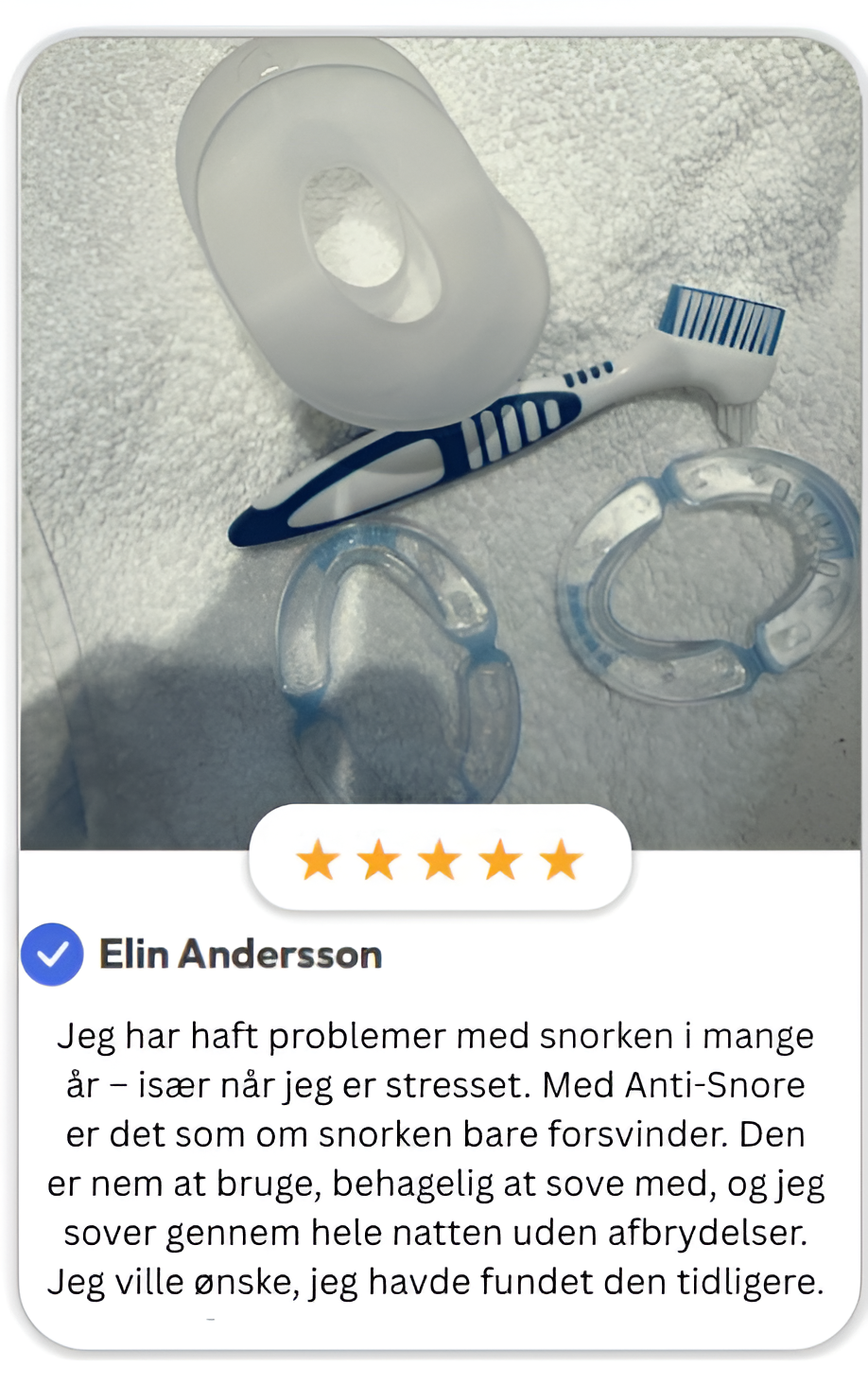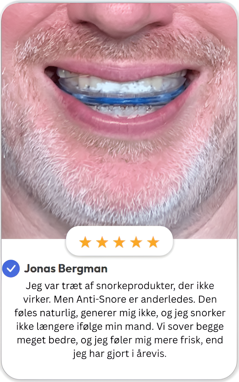 Anti-Snore™ ændrer alt dette – på en naturlig måde. Med en lille justering af kæben hjælper den dig med at trække vejret frit og sove dybt… uden lyd, uden piller og uden store apparater.