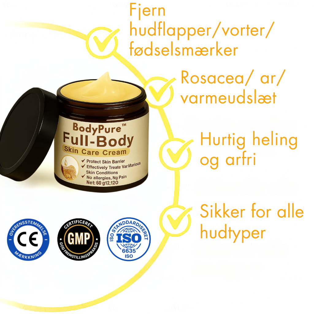 Sig farvel til hudflapper, vorter og fødselsmærker. BodyPure™ heler hurtigt, reducerer ar og rosacea, og er sikker for alle hudtyper – helt uden kemikalier