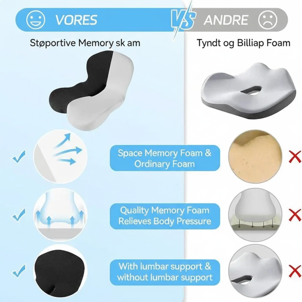 Designet til at reducere belastning på iskiasnerven, halebenet, hofter og ben. Perfekt til lange køreture, kontorarbejde og daglig brug.