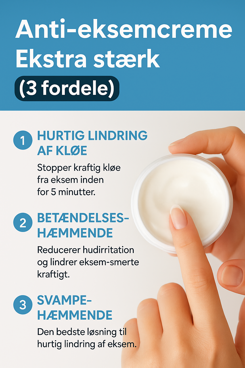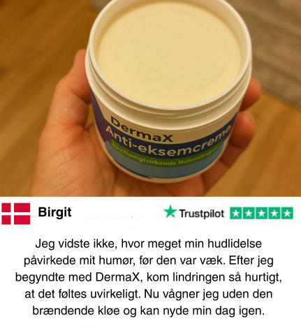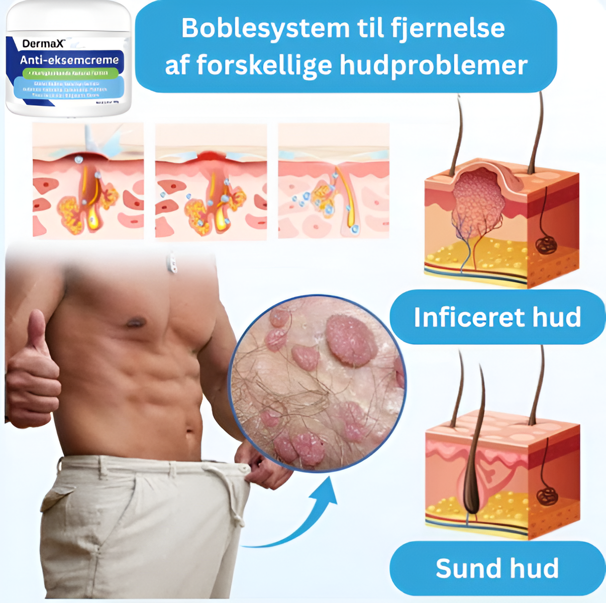 DermaX™ Anti-eksemcreme stopper kløen på 5 minutter og beroliger huden med det samme. Den kraftige formel arbejder i dybden uden steroider eller irritation. Ikke mere kradsen til blods.Med naturlige planteekstrakter med svampedræbende egenskaber — hjælper mod fodsvamp, lyskesvamp, psoriasis, tinea versicolor, ringorm og eksem, samtidig med at hudens naturlige barriere styrkes.Din hud føles blød, rolig og sunigen. Og dig? Du føler dig endelig fri, lettet og tør være dig selv.