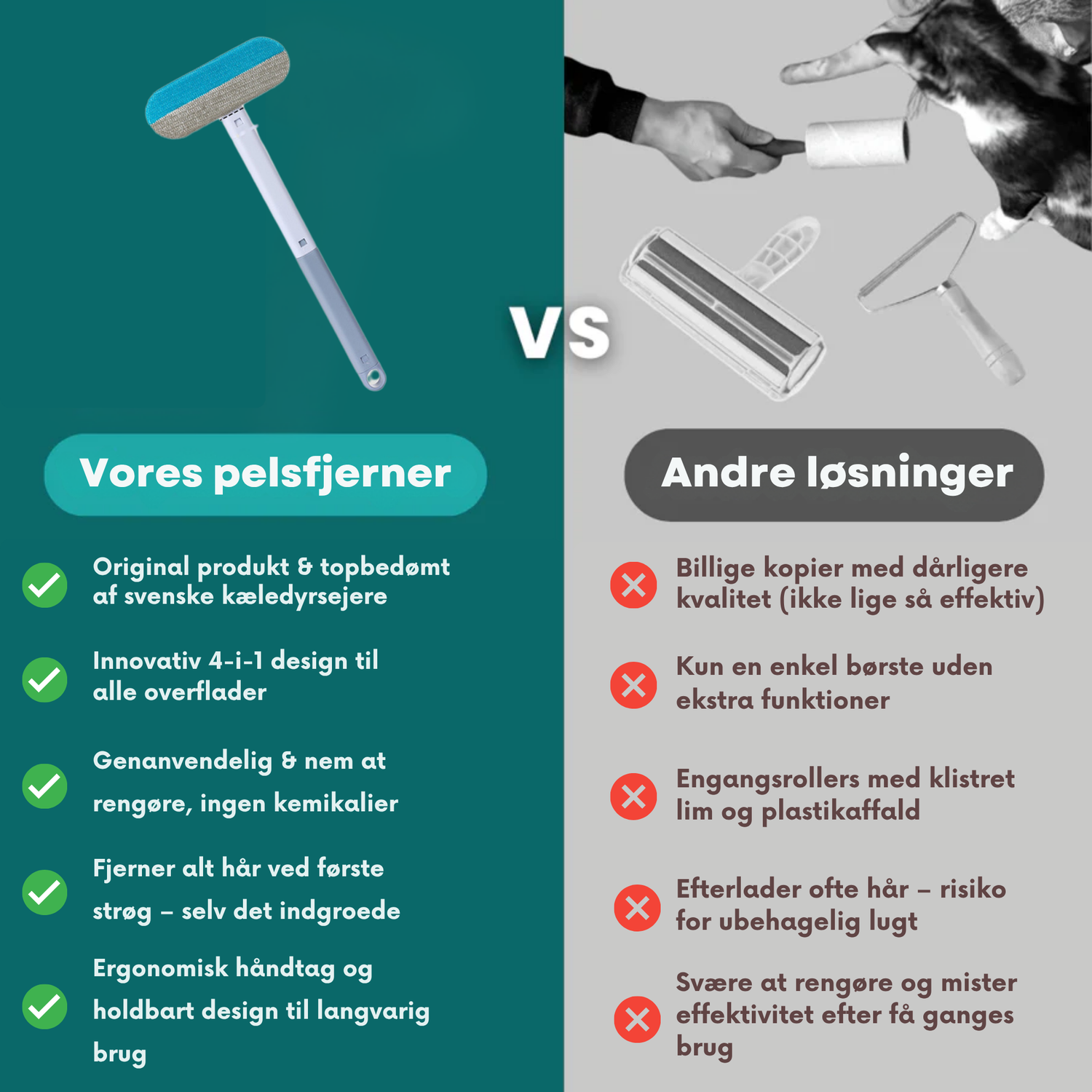 Vi ved, hvor frustrerende det er, når dyrehår sætter sig overalt – på tøj, sofaer, tæpper og i bilen – og intet synes at få det væk helt. Engangsrollers og klæbebånd mister hurtigt effekten, koster mange penge over tid og indeholder ofte skadelige kemikalier.