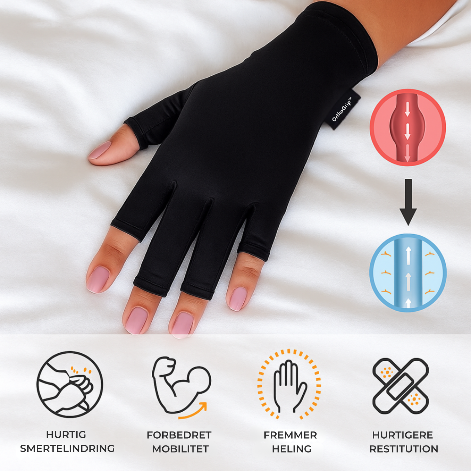 OrthoGrip™-handskerne giver den perfekte kompression, der lindrer spændinger og støtter de områder, der gør mest ondt.