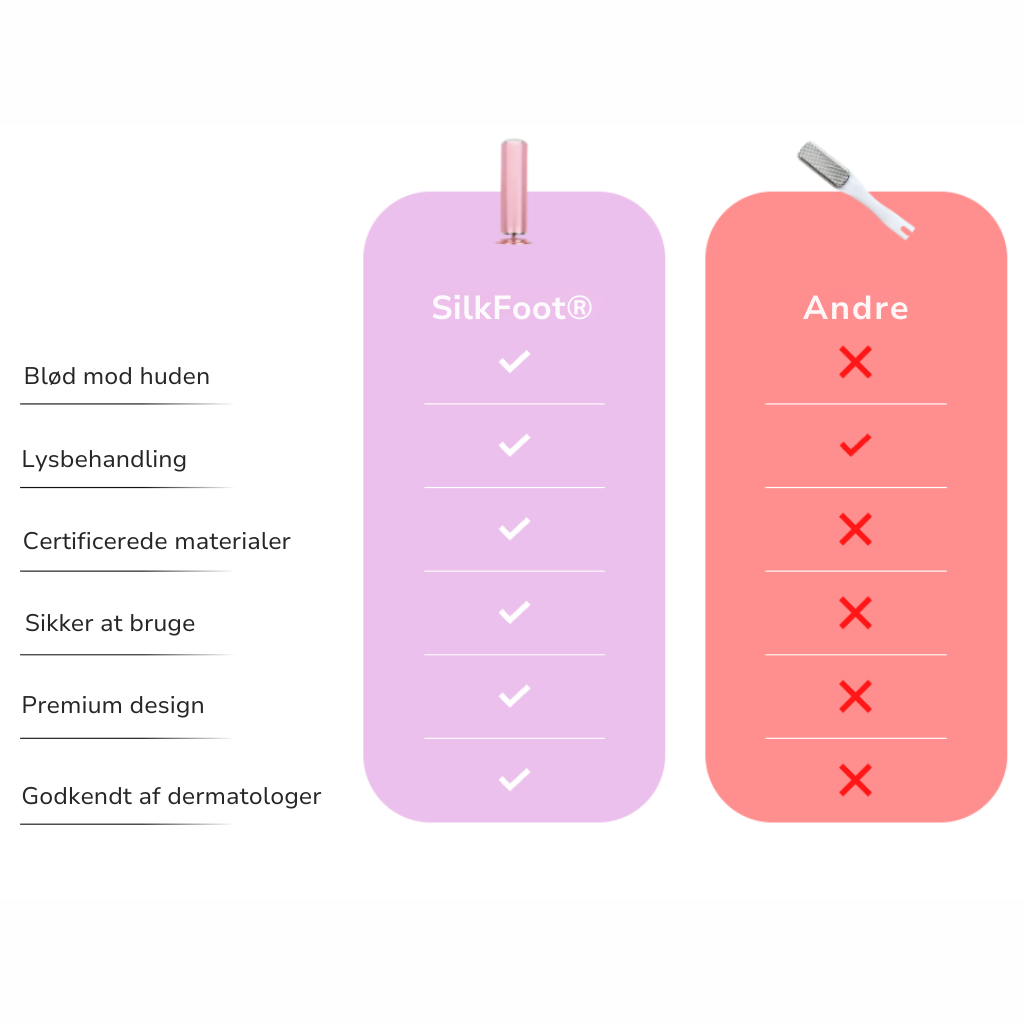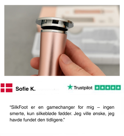SilkFoot® giver dig silkebløde fødder på en sikker og behagelig måde. Med premium design, dermatolog-godkendte materialer og avanceret lysbehandling sætter den en ny standard for fodpleje – hvor andre produkter skuffer, leverer SilkFoot®.