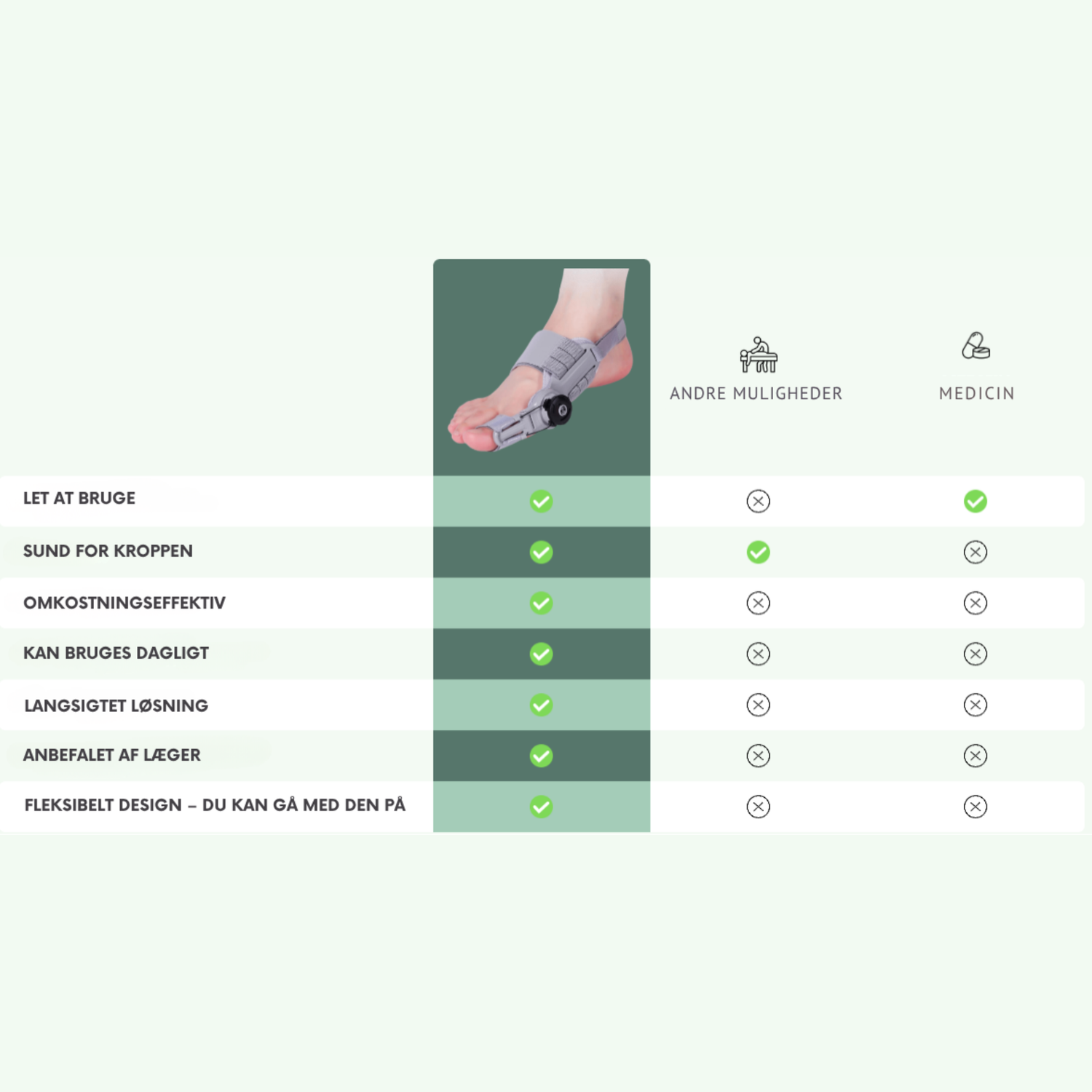 ValgusPro™ hjælper dine fødder med at finde balancen igen. Den støtter kroppens naturlige heling, retter storetåen, lindrer smerte og forbedrer din gang, så du kan bevæge dig frit igen.